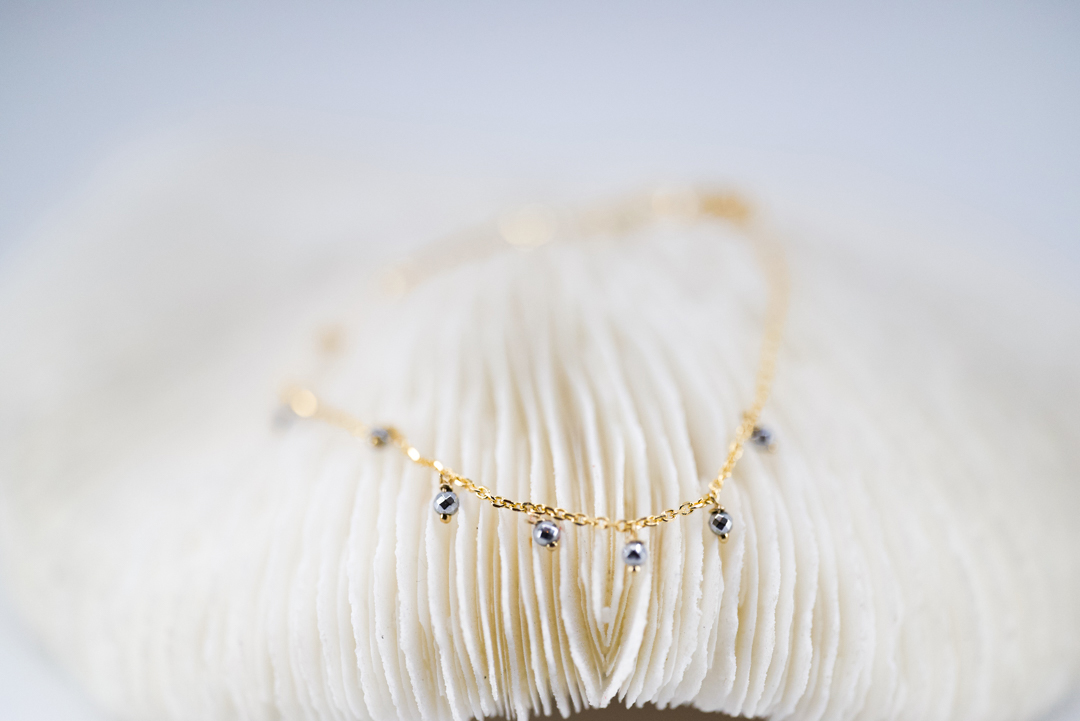 Le bracelet Constellation est en plaqué or 3 microns et composé de pierres d’hématites.